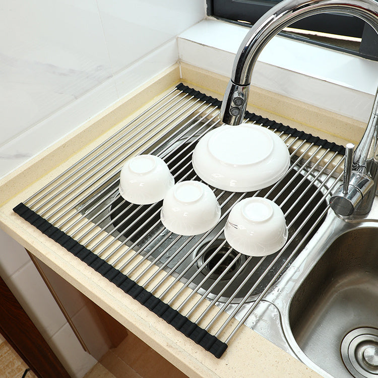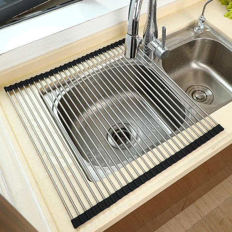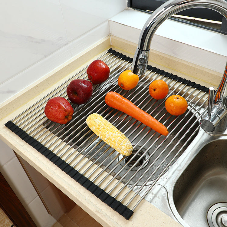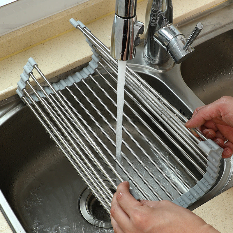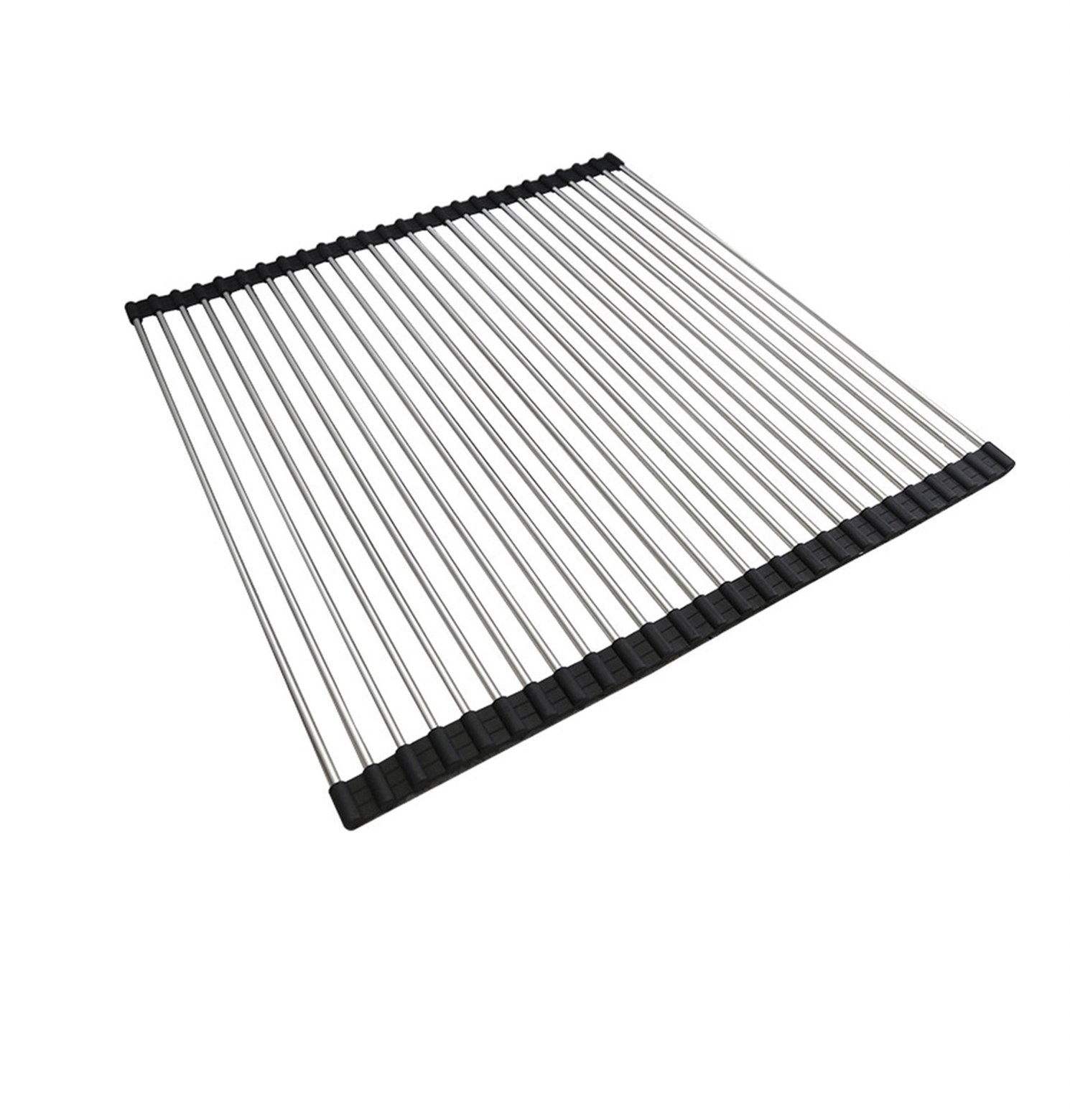 Je legt hem eenvoudig over de wasbak heen om een extra werkblad te creëren waarop je de pannen, borden, voedingswaren kwijt kunt. De oprolbare mat is ook ideaal als afdruiprek tijdens de handafwas.Het ontwerp is stijlvol en vernuftig, door de slanke spijlen is hij eenvoudig op te rollen en op te bergen. Hij is gemaakt van RVS en rubber.