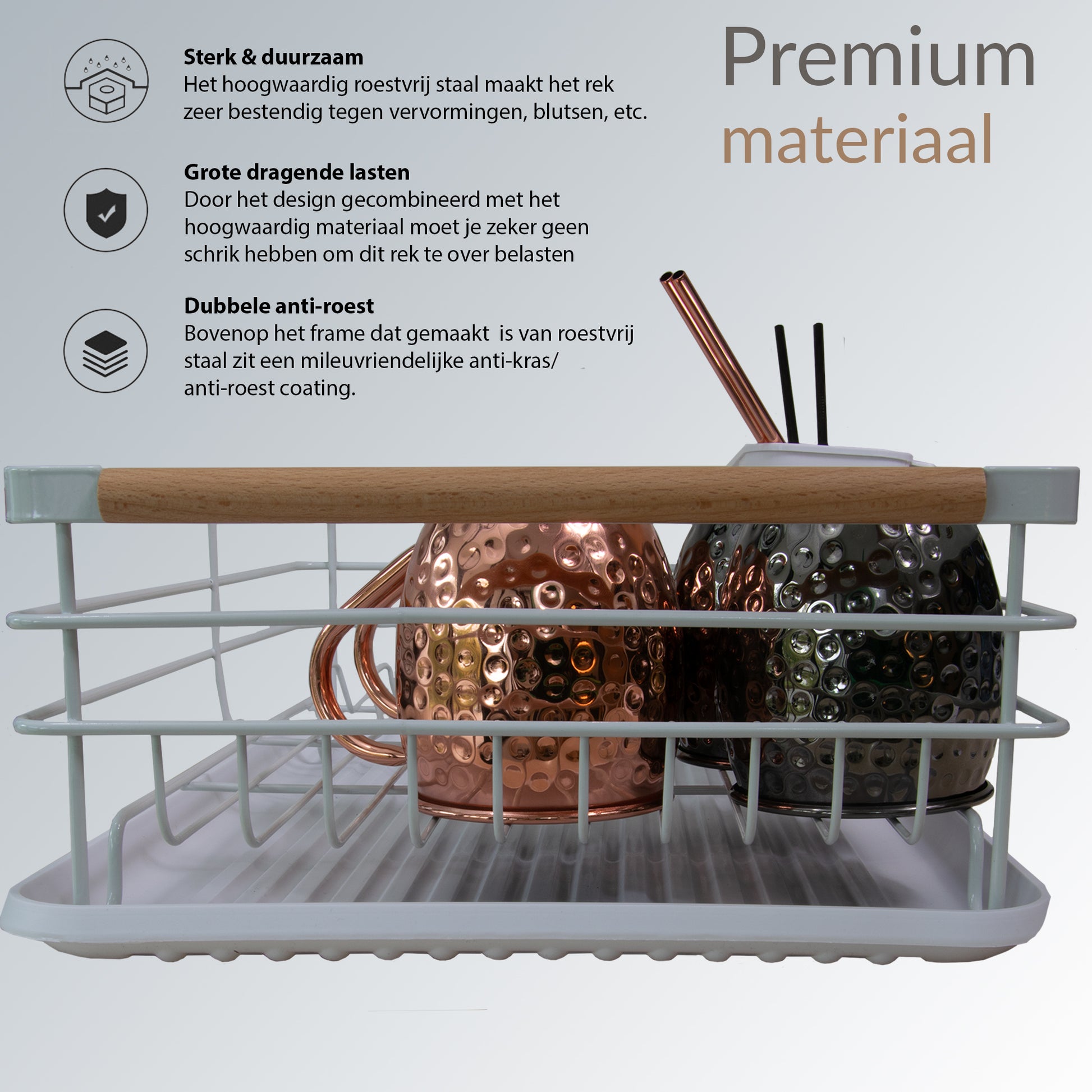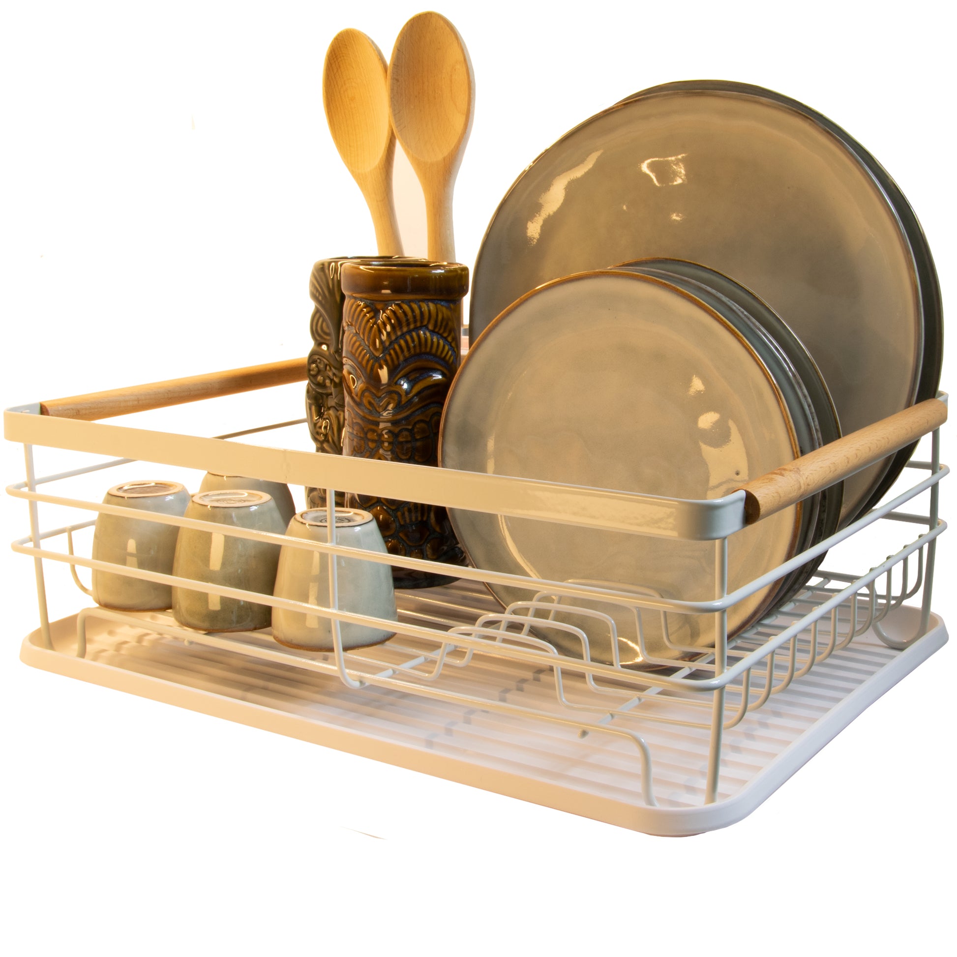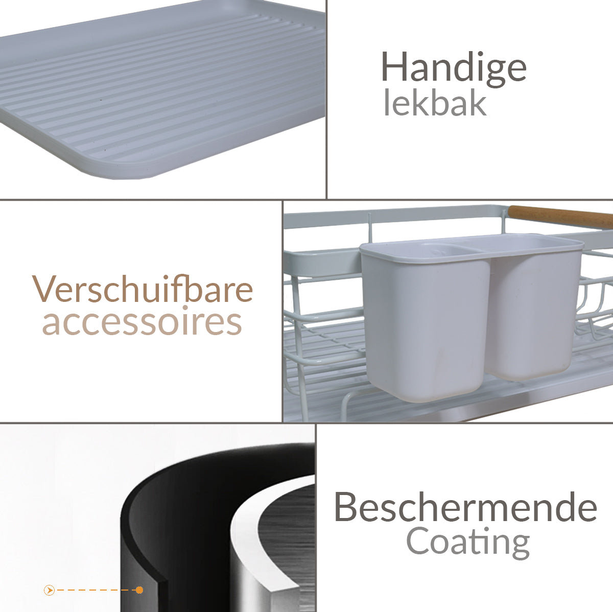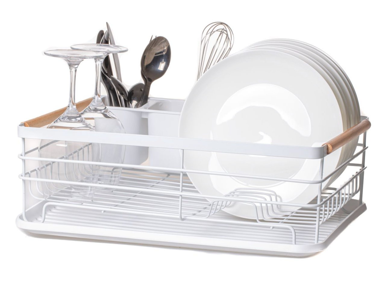 Dit afdruiprek biedt ruimte voor borden, pannen, glaswerk en bestek. De lekbak vangt het overtollige water op en houdt je aanrecht droog.