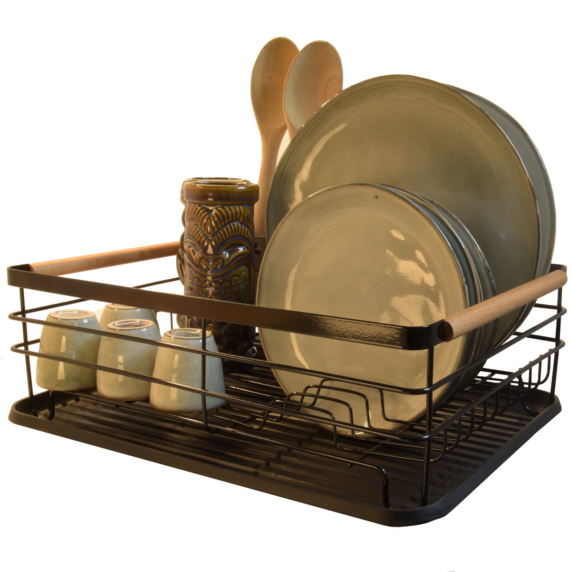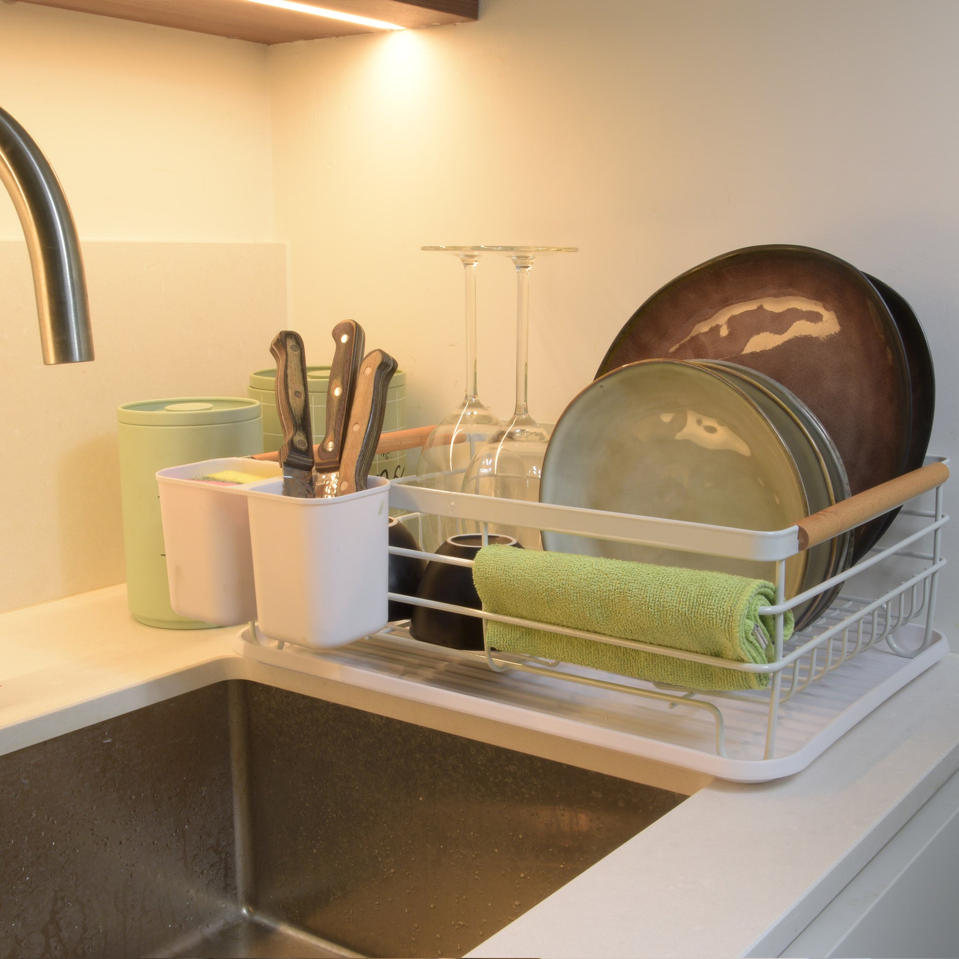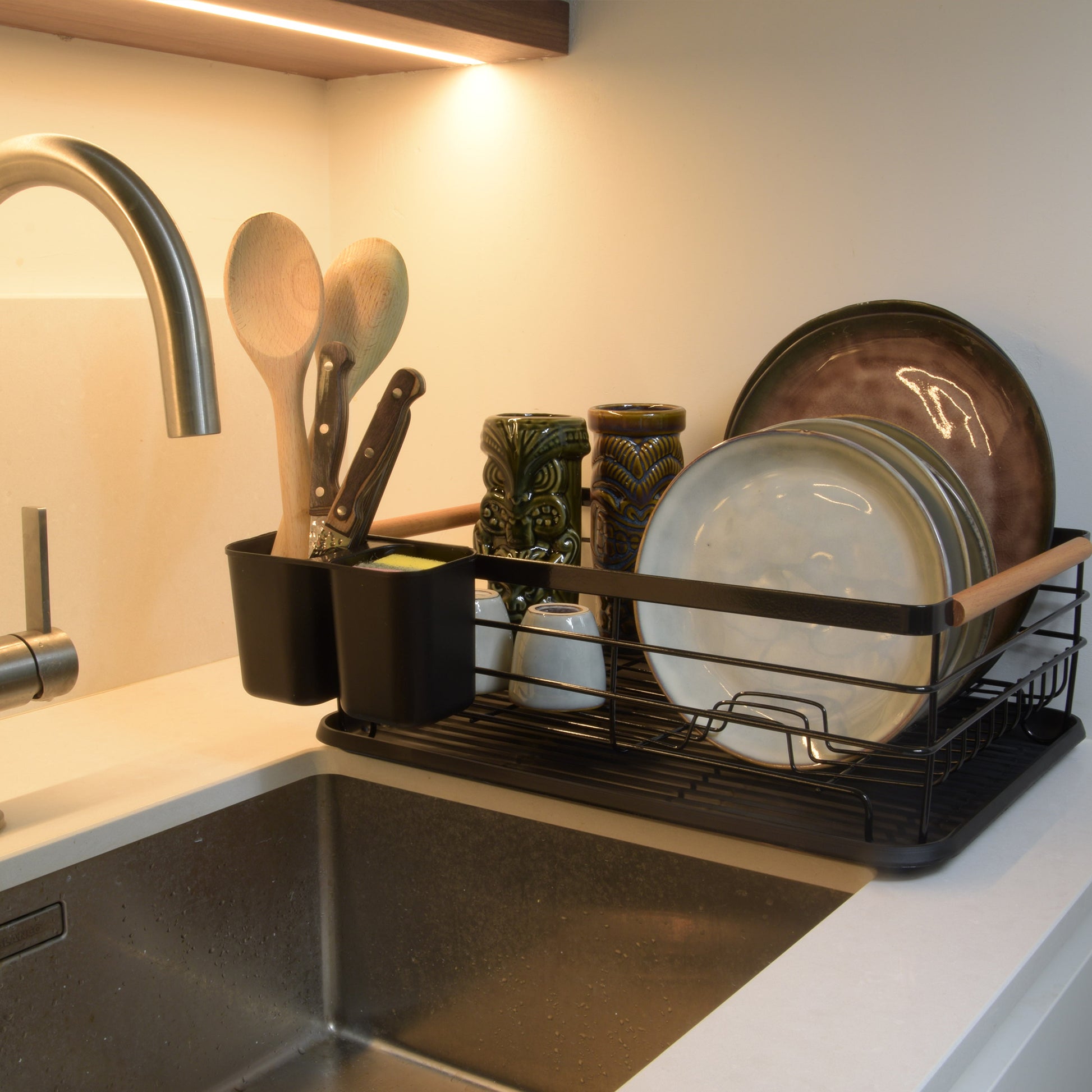 Dit afdruiprek biedt ruimte voor borden, pannen, glaswerk en bestek. De lekbak vangt het overtollige water op en houdt je aanrecht droog.