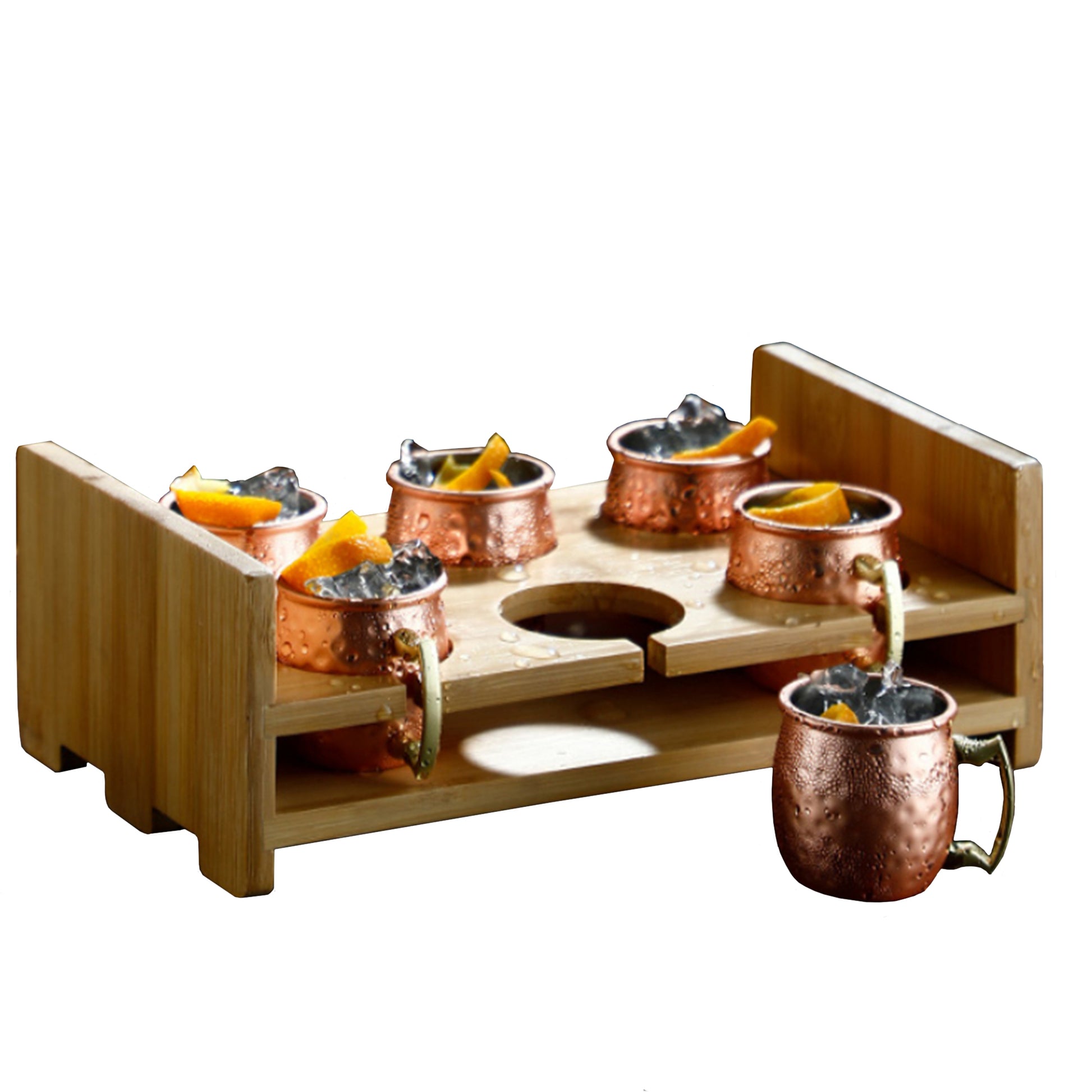 De gladde rand en het handvat maken een aangenaam drinken én vasthouden mogelijk, koper is namelijk een goede geleider. De koude ingrediënten in de Moscow Mule mok blijven op deze manier ijskoud - en ook de beker zelf. De houten houder is stabiel en kan makkelijk verplaatst worden, met alle bekers er in.