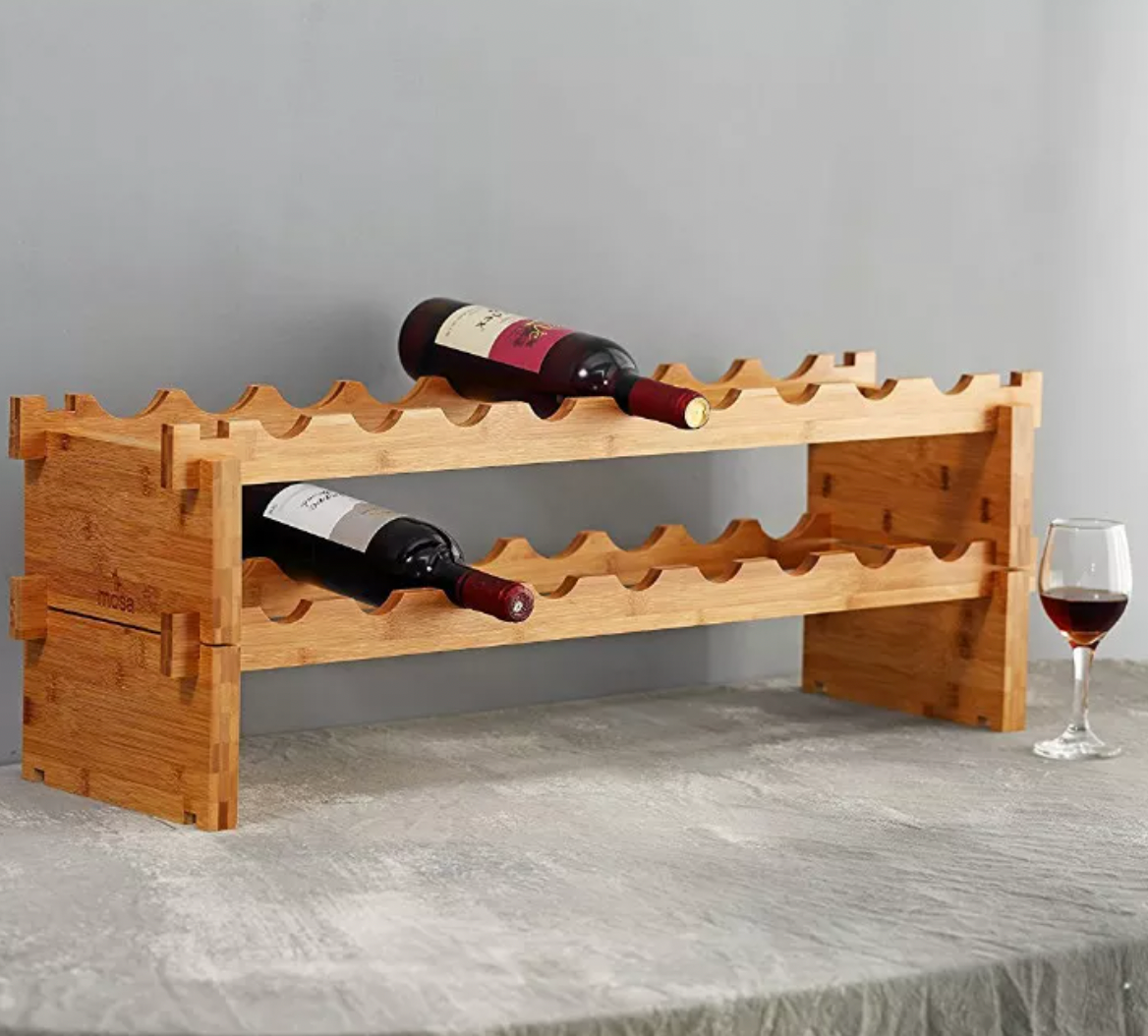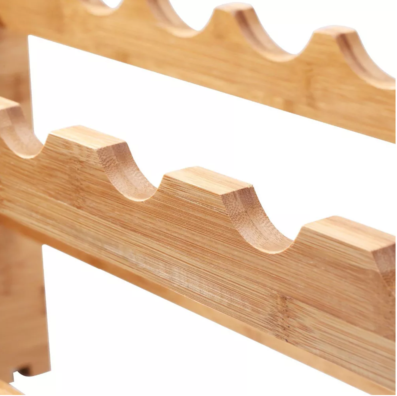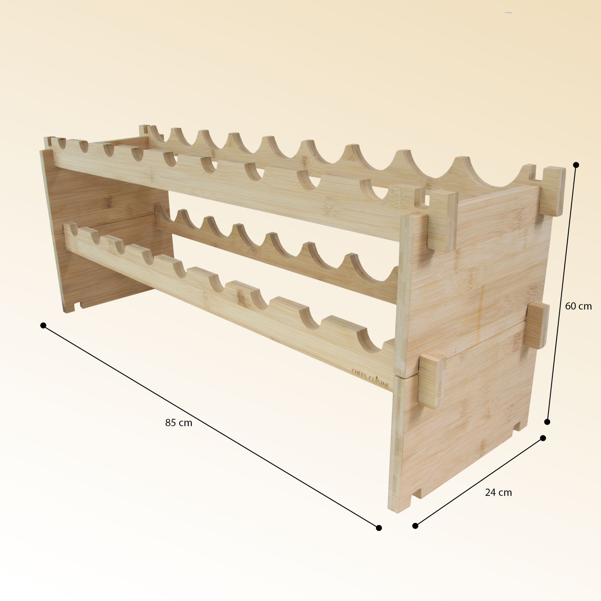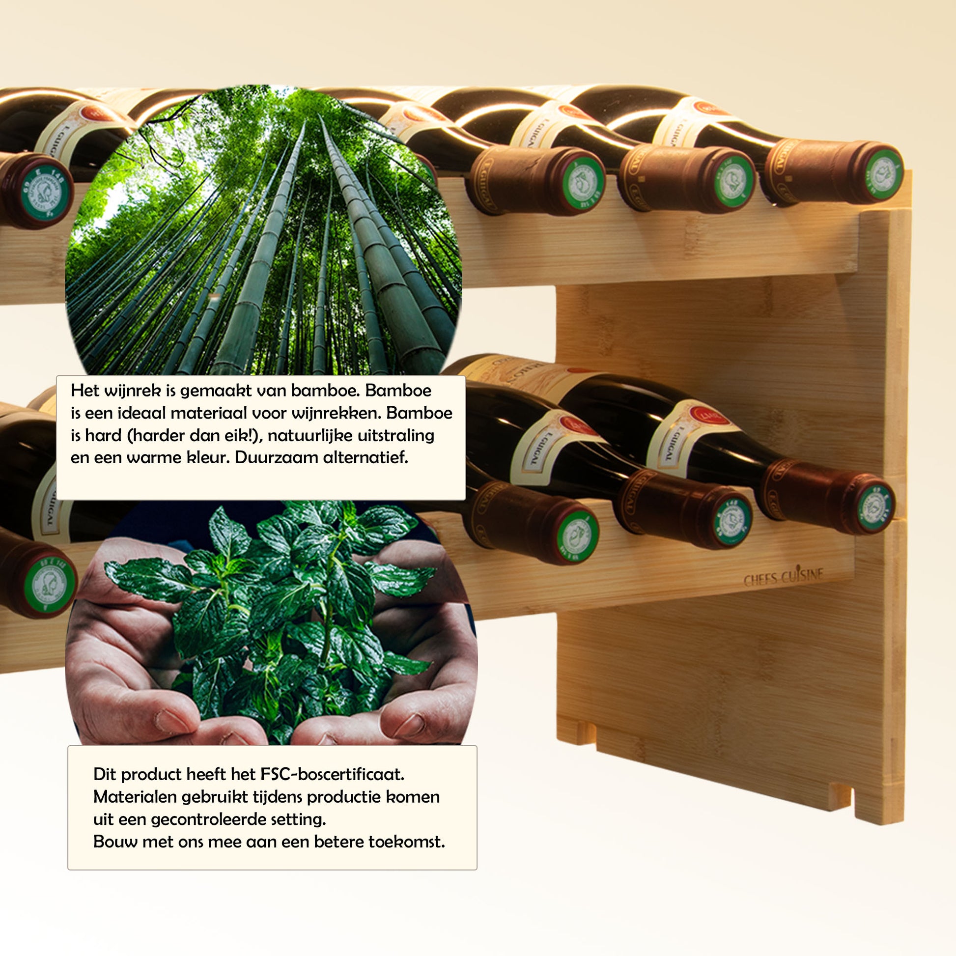 Dit wijnrek met speciaal ontworpen golfstaven van Chefs Cuisine houden uw flessen stabiel en houden de kurken volledig gehydrateerd zodat uw wijn vers blijft. Elke fles is gemakkelijk toegankelijk en goed beschermd. Bamboe is van nature sterk en flexibeler en duurzamer dan het meeste houtsoorten vanwege de langere vezels. Dankzij het compact design en de trendy look past het wijnrek zonder problemen in uw keuken of woonkamer. Wist je dat het bovendien veel beter is om een wijnfles liggend te bewaren? Zo komt de wijn in contact met de kurk en kan de kurk niet uitdrogen! Kortom, een perfect geschenk voor jezelf of voor iemand die gek is op wijn!